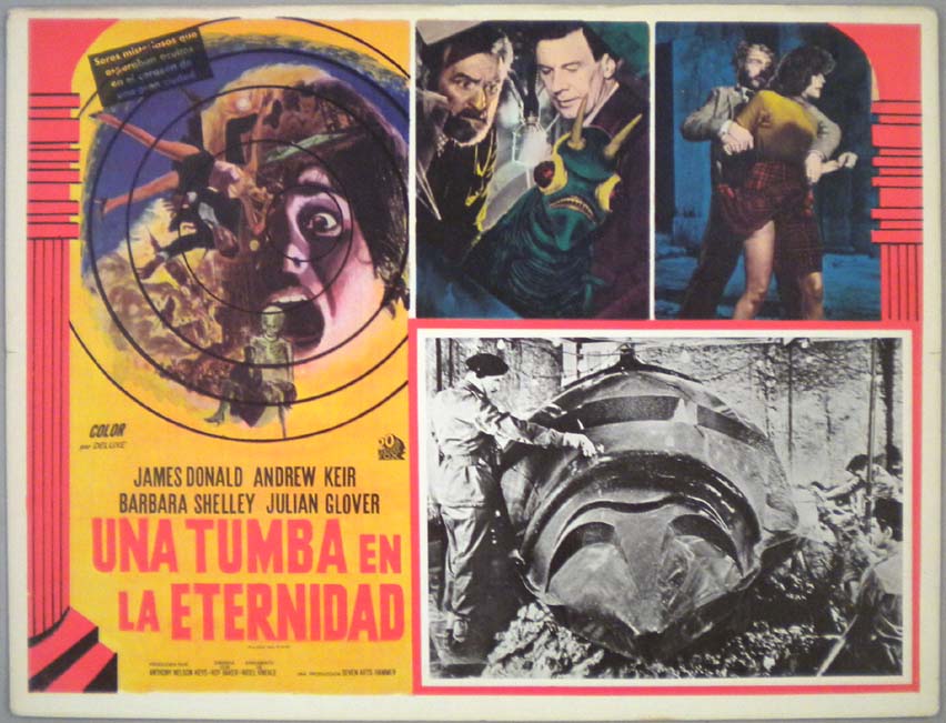 Beautiful Mexican jumbo lobby card (12.75x16.75") from the 1967 British / Hammer sci-fi / horror film, FIVE MILLION YEARS TO EARTH, which starred James Donald, Andrew Keir, Barbara Shelley and Julian Glover. $25 |