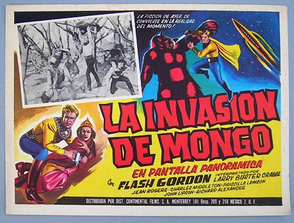 Beautiful Mexican jumbo lobby card (12.5x16.5") from the 1938 Universal sci-fi serial, FLASH GORDON'S TRIP TO MARS, which starred Buster Crabbe, Jean Rogers, Charles Middleton, Frank Shannon, Beatrice Roberts, Donald Kerr, Richard Alexander and C. Montague Shaw. $35 each |