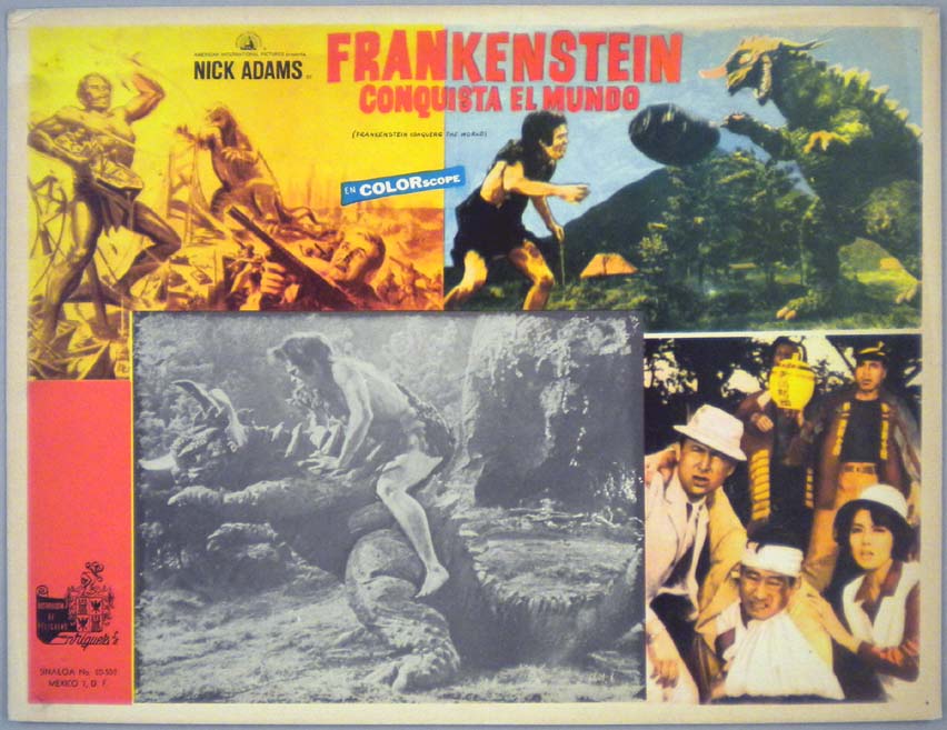 Beautiful Mexican jumbo lobby card (12.5x16.25") from the 1965 Toho / Japanese sci-fi / horror film, FRANKENSTEIN CONQUERS THE WORLD, which starred Tadao Takashima, Nick Adams and Kumi Mizuno. $35 |