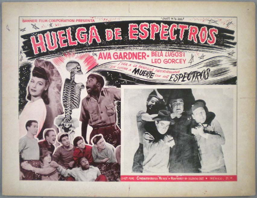 Beautiful Mexican jumbo lobby card (12.5x16.5") from the 1941 Monogram comedy / horror film, SPOOKS RUN WILD, which starred Bela Lugosi, Leo Gorcey, Bobby Jordan, Huntz Hall, Sunshine Sammy Morrison, Dave O'Brien, Dorothy Short, David Gorcey and Angelo Rossitto. The film was part of the Bowery Boys / East Side Kids / Dead End Kids series. $35 each |