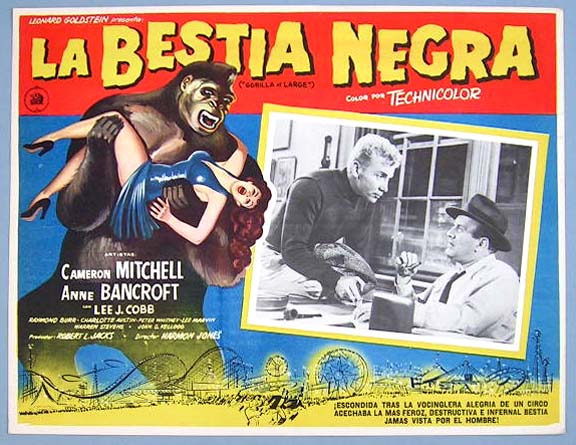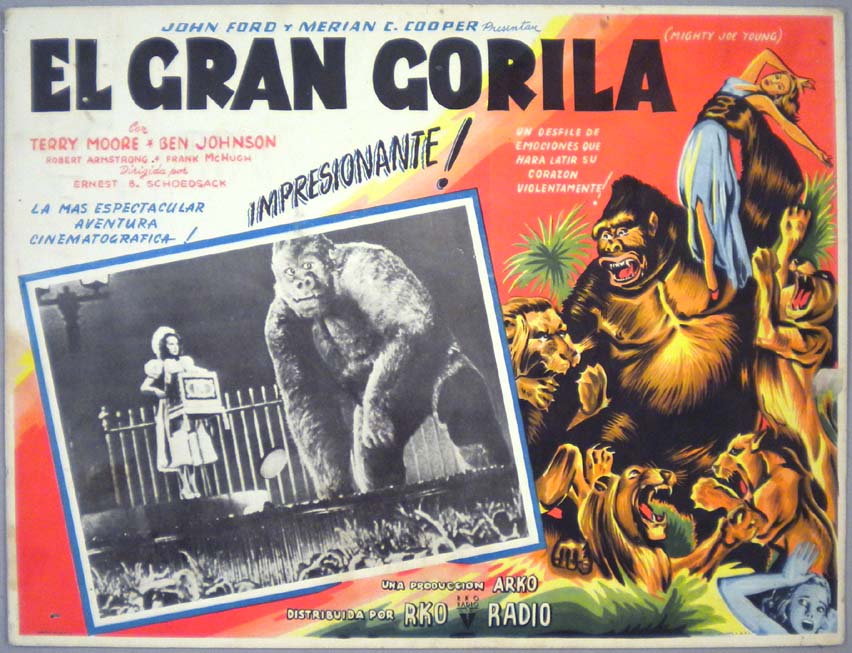 Beautiful Mexican jumbo lobby card (12x15.75") from the 1952 Realart sci-fi / comedy / jungle adventure film, BELA LUGOSI MEETS A BROOKLYN GORILLA, which starred Bela Lugosi, Duke Mitchell, Sammy Petrillo, Charlita, Muriel Landers, Al Kikume and Ray 'Crash' Corrigan. $35 |