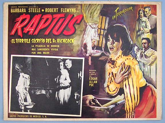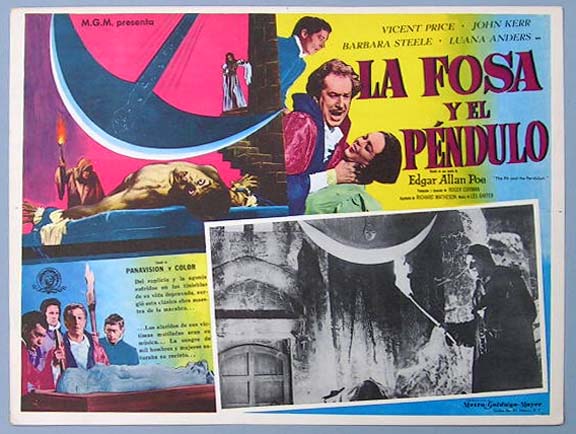 Beautiful Mexican jumbo lobby card (12.5x16.5") from the 1961 AIP horror film, THE PIT AND THE PENDULUM, which starred Vincent Price, Barbara Steele, John Kerr, Luanna Anders and Antony Carbone. This film was directed by Roger Corman with a screen play by Richard Matheson. It was based on a short story by Edgar Allan Poe. $20 each |