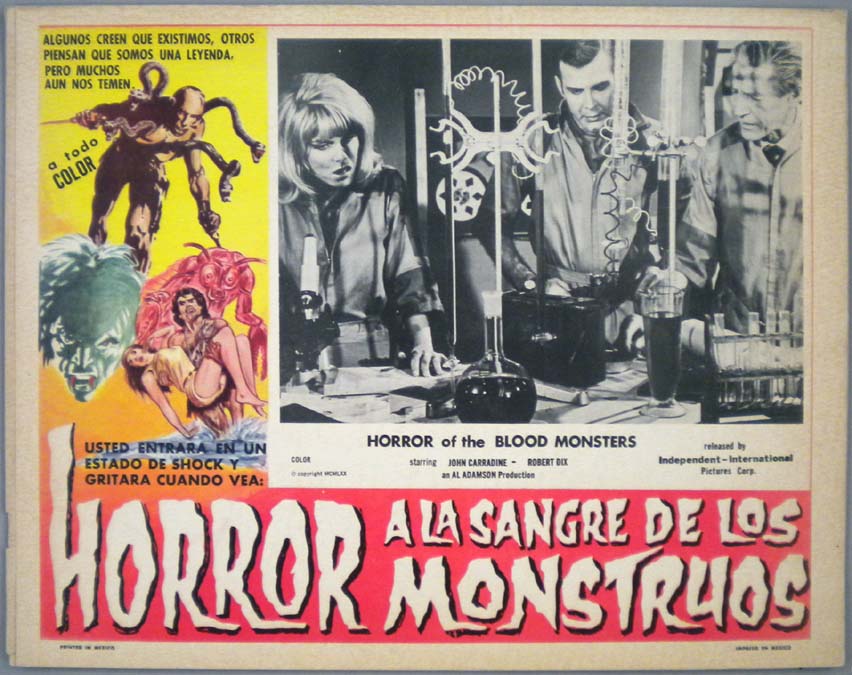 Beautiful Mexican jumbo lobby card (12x15") from the 1972 International Pictures horror / sci-fi film, BRAIN OF BLOOD, which starred Grant Williams, Kent Taylor, John Bloom, Regina Carrol, Vicki Volante, Reed Hadley and Angelo Rossitto. The film was directed by Al Adamson. $20 each |