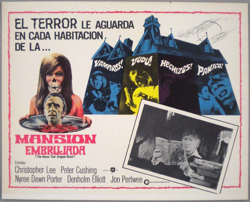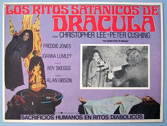 Beautiful Mexican jumbo lobby card (12.5x16.5") from the 1974 British / Hammer horror film, THE SATANIC RITES OF DRACULA, which starred Christopher Lee, Peter Cushing, Michael Coles, William Franklyn, Freddie Jones and Joanna Lumley. $20 each |
