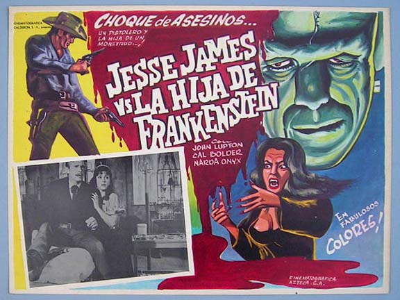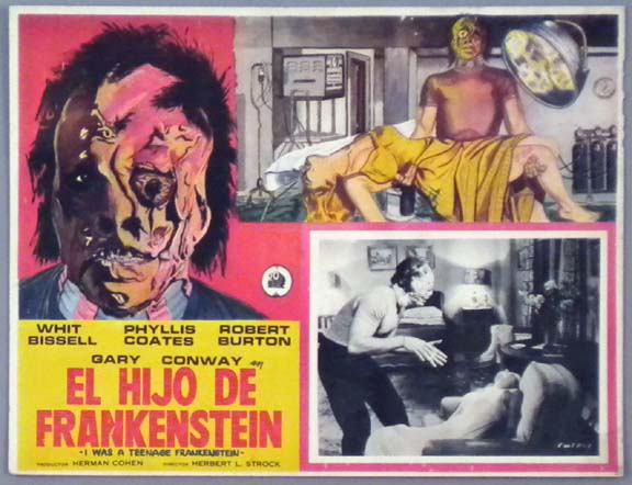 Beautiful Mexican lobby card (11x14") from the 1965 Allied Artists horror / sci-fi film, FRANKENSTEIN MEETS THE SPACE MONSTER, which starred Marilyn Hanold, Lou Cutell, Robert Reilly and James Karen. $35 |