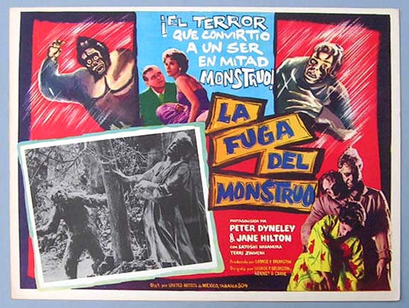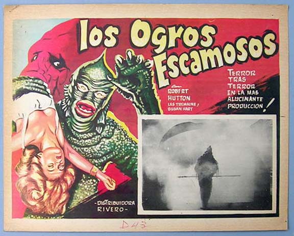 Beautiful Mexican jumbo lobby card (13x16.5") from the 1963 independent sci-fi / monster film, THE SLIME PEOPLE, which starred Robert Hutton, Les Tremayne, Susan Hart, Robert Burton and William Boyce. The artwork makes the monsters look very much like the "Creature from the Black lagoon." $35 each |
