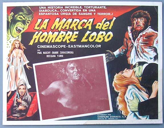 Beautiful Mexican jumbo lobby card (12.5x16.5") from the 1973 Spanish horror film, RETURN OF THE WEREWOLF, which starred Paul Naschy, Fabiola Falcon, Maritza Olivares, Jose Manuel Martin and Eduardo Calvo. $15 each |