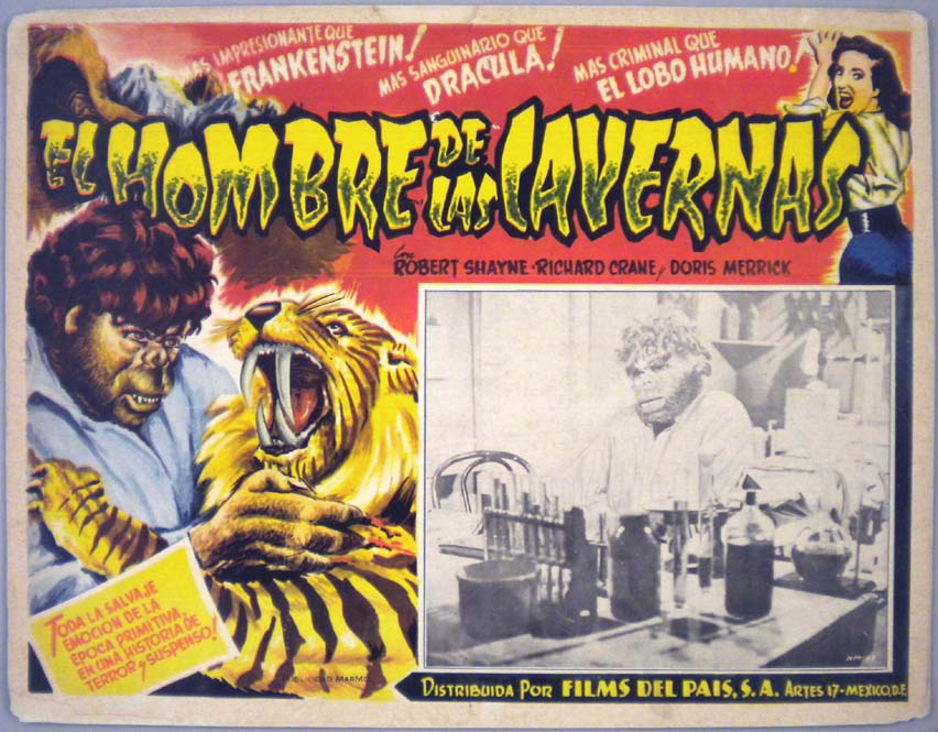 Beautiful Mexican jumbo lobby card (12.5x16.5") from the 1950 Eagle Lion sci-fi / caveman film, PREHISTORIC WOMEN, which starred Laurette Luez, Allan Nixon, Joan Shawlee, Judy Landon and Mara Lynn. This card features some of the best art of any Mexican cards! $65 |
