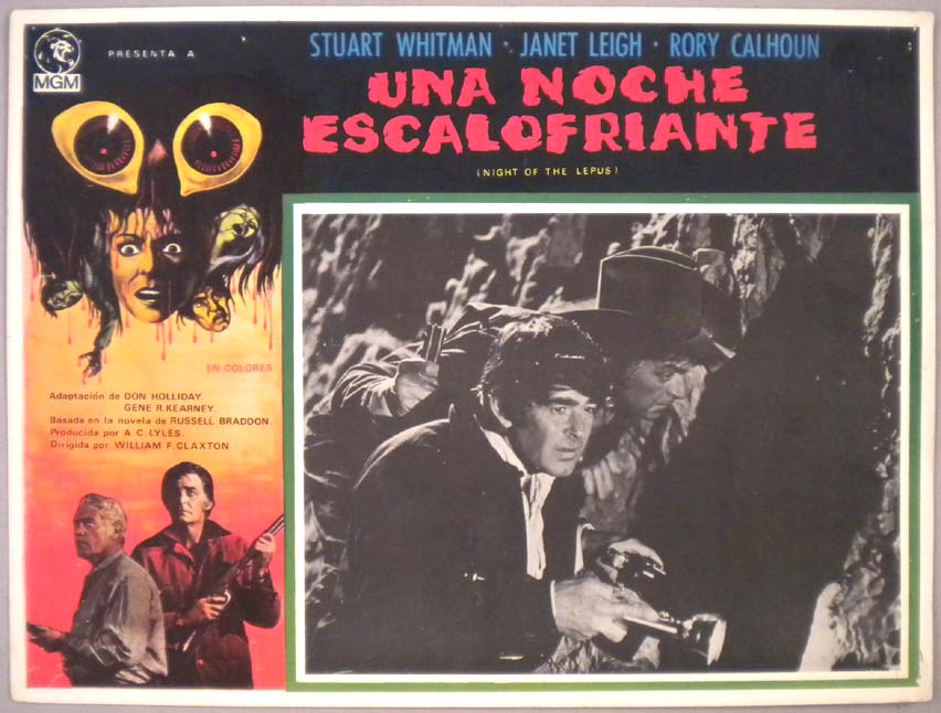 Classic Mexican jumbo lobby card (12.75x16.5") from the 1955 Universal sci-fi / monster film, TARANTULA, which starred John Agar, Mara Corday, Leo G. Carroll, Nestor Paiva, Ross Elliott and Clint Eastwood. The film was directed by Roger Corman and was based on stories by Edgar Allan Poe. $35 each |