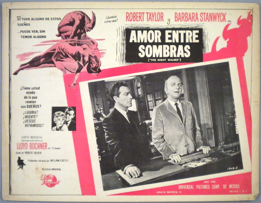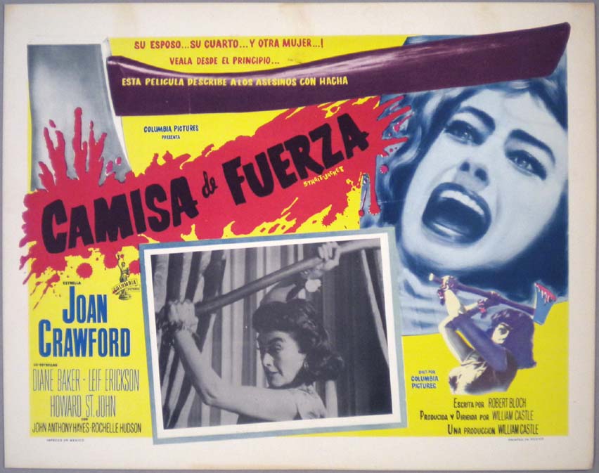 Beautiful Mexican lobby card (11x14") from the 1964 Columbia horror film, STRAIT-JACKET, which starred Joan Crawford, Diane Baker, Leif Erickson, Howard St. John, John Anthony Hayes and Rochelle Hudson. The film was directed by William Castle. $25 |