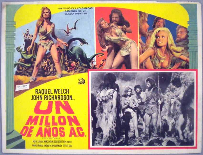 Beautiful Mexican jumbo lobby card (12.5x16.25") from the 1966 20th Century Fox / Hammer sci-fi / dinosaur film, ONE MILLION YEARS B.C., which starred Raquel Welch, John Richardson, Percy Herbert, Robert Brown and Martine Beswick. $25 |