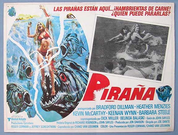 Beautiful Mexican jumbo lobby card (12.5x16.5") from the 1978 New World Pictures tongue-in-cheek horror film, PIRANHA, which starred Bradford Dillman, Heather Menzies, Kevin McCarthy, Keenan Wynn, Dick Miller and Barbara Steele. The film was directed by Joe Dante, written by John Sayles and produced by Roger Corman. $20 each |