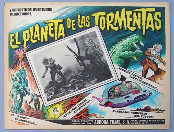 Beautiful Mexican jumbo lobby card (12.5x16.5") from the 1962 Russian sci-fi film, PLANET OF STORMS, which starred Vladimir Yemelyanov, Georgi Zhzhyonov, Gennadi Vernov and Yuri Sarantsev. $25 |