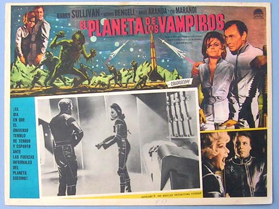 Beautiful Mexican jumbo lobby card (12.5x16.5") from the 1965 Italian sci-fi / horror film, PLANET OF THE VAMPIRES, which starred Barry Sullivan, Norma Bengell, Angel Aranda, Evi Marandi and Stelio Candelli. The film was directed by Mario Bava. $25 each |