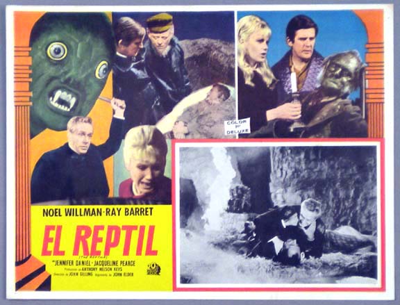 Beautiful Mexican jumbo lobby card (12.5x16.5") from the 1966 Hammer horror film, THE REPTILE, which starred Noel Willman, Jennifer Daniels, Ray Barrett, Jacqueline Pearce, Michael Ripper, John Laurie, Marne Maitland, Harold Pinter, Charles Lloyd Pack, Harold Goldblatt and George Woodbridge. The film was directed by John Gilling and written by Anthony Hinds. $25 each |