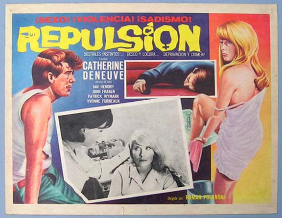 Beautiful Mexican jumbo lobby card (12.5x16.5") from the 1965 British horror / suspense film, REPULSION, which starred Catherine Deneuve, Ian Hendry, John Fraser, Yvonne Furneaux, Patrick Wymark and Renee Houston. The film was directed by Roman Polanski. $35 each |
