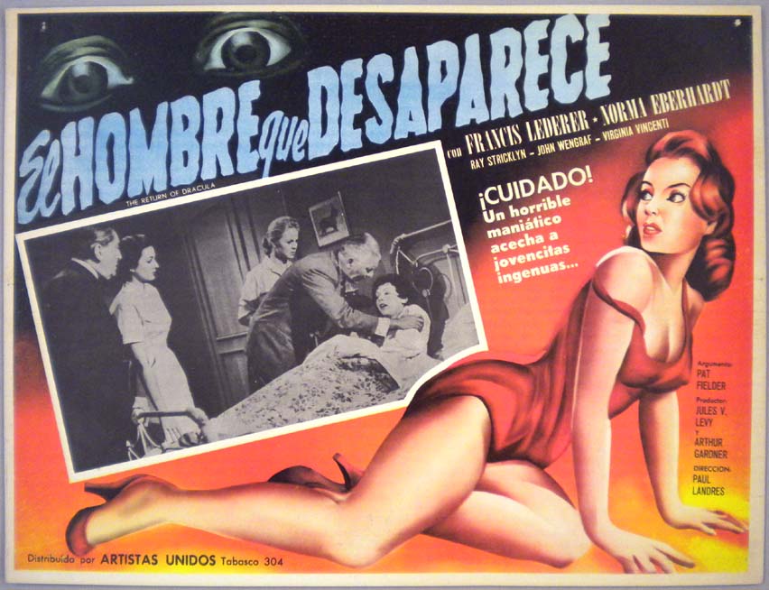 Beautiful Mexican jumbo lobby card (12.5x16.5") from the 1958 United Artists horror / vampire film, THE RETURN OF DRACULA, which starred Francis Lederer, Norma Eberhardt, Ray Stricklyn and Jimmy Baird. $35 |