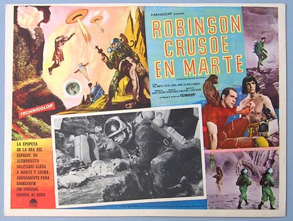 Beautiful Mexican jumbo lobby card (12.5x16.5") from the 1964 Paramount sci-fi film, ROBINSON CRUSOE ON MARS, which starred Paul Mantee, Victor Lundin, Adam West and Mona the monkey. Just for fun, take a look at the artwork at the upper left section, and compare it to the posters from, Santo vs. la Invasion de los Marcianos. $25 each |