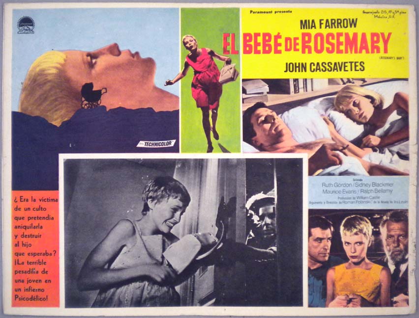 Beautiful Mexican jumbo lobby card (12.5x16.5") from the 1968 Paramount horror film, ROSEMARY'S BABY, which starred Mia Farrow, John Cassavettes, Ruth Gordon, Sidney Blackmer, Ralph Bellamy and Maurice Evans. The film was directed by Roman Polanski and produced by William Castle. $20 each |
