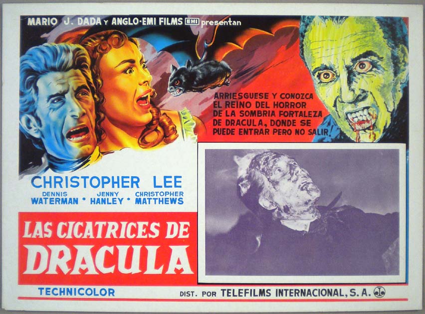 Beautiful Mexican jumbo lobby card (12x16.5") from the 1970 Hammer horror / vampire / monster film, SCARS OF DRACULA, which starred Christopher Lee, Dennis Waterman, Jenny Hanley, Patrick Troughton and Michael Ripper. $25 |