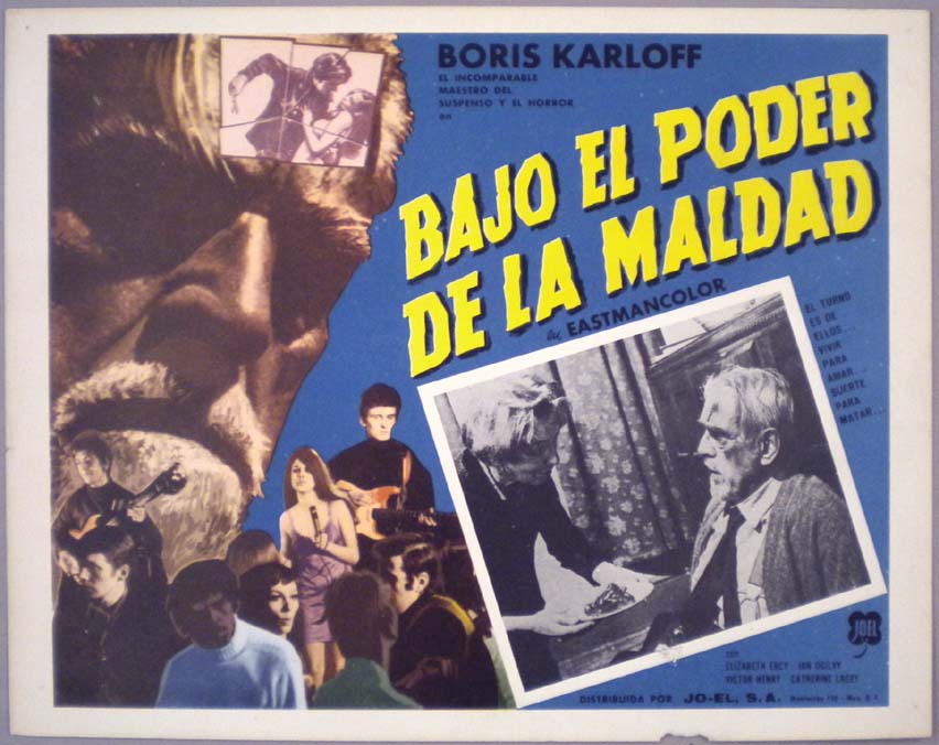 Beautiful Mexican lobby card (11x14") from the 1967 British / Allied Artists horror film, THE SORCERERS, which starred Boris Karloff, Elizabeth Ercy, Ian Ogilvy, Victor Henry and Sally Sheridan. The film was directed by Michael Reeves. $25 |