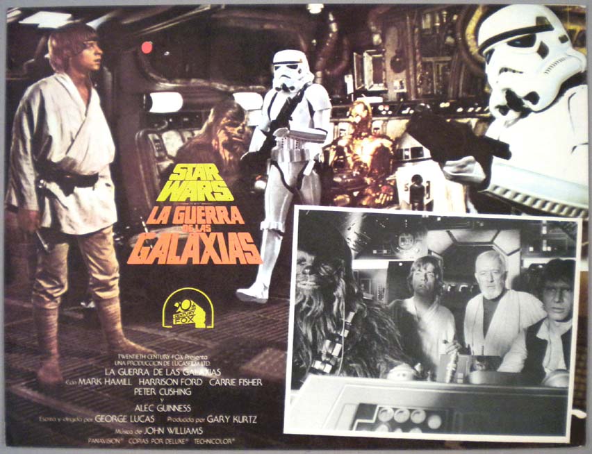 Beautiful Mexican borderless lobby card (12x15.75") from the 1977 20th Century Fox sci-fi classic, STAR WARS, which starred Mark Hamill, Harrison Ford, Carrie Fisher, Peter Cushing and Alec Guinness. The film was directed by George Lucas. $75 |