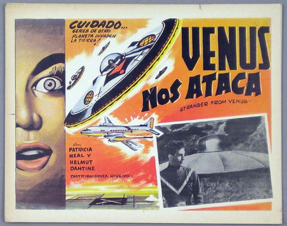Beautiful Mexican jumbo lobby card (13x16.25") from the 1954 British sci-fi film, STRANGER FROM VENUS, which starred Patricia Neal, Helmut Dantine, Derek Bond, Cyril Luckham, Willoughby Gray, Marigold Russell, Arthur Young, Kenneth Edwards, David Garth, Stanley Van Beers, Nigel Green, Graham Stuart and John Le Mesurier. The film was directed by Burt Balaban. Any poster material from this film is quite rare! $35 |