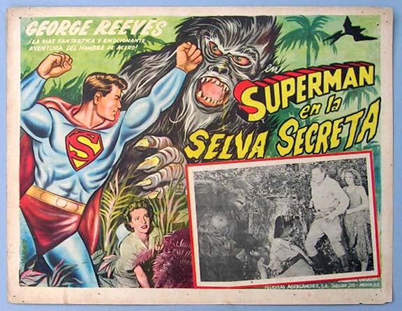Beautiful Mexican jumbo lobby card (12.5x16.5") from the 1954 MPTV adventure / sci-fi film, SUPERMAN AND THE JUNGLE DEVIL, which starred George Reeves, Noel Neill, Jack Larson, John Hamilton, Robert Shayne and Sterling Holloway. This movie was created by combining three episodes from the second season of the popular ADVENTURES OF SUPERMAN television program. Since Americans could watch SUPERMAN for free on TV, this film was mainly distributed in foreign markets -- making U.S. produced posters and lobby cards from the film quite rare. $85 each |