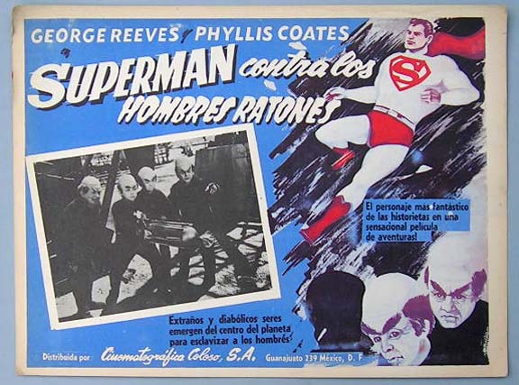 Beautiful Mexican jumbo lobby card (12.5x17") from the 1951 Lippert sci-fi / action film, SUPERMAN AND THE MOLE MEN, which starred George Reeves, Phyllis Coates, Jeff Corey, Walter Reed and J. Farrell MacDonald. The film was a two-part pilot for the ADVENTURES OF SUPERMAN television show. $55 each |