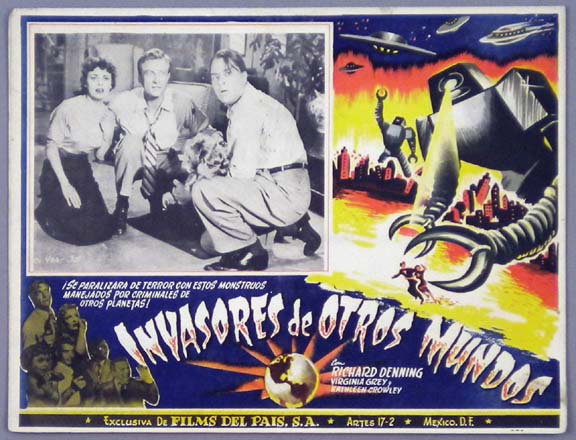 Beautiful Mexican jumbo lobby card (12.5x16.25") from the 1954 Allied Artists sci-fi / robot / alien invader film, TARGET EARTH, which starred Richard Denning, Kathleen Crowley, Virginia Grey, Richard Reeves and Robert Roark. The film was directed by Sherman A. Rose. Robot card - $65 .... People scene - $45 |