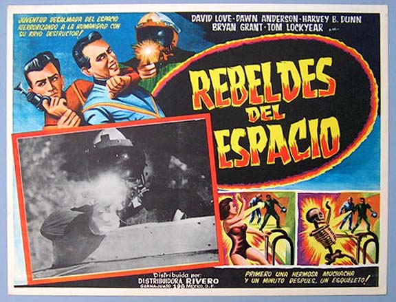 Beautiful Mexican jumbo lobby card (12.5x16.5") from the 1959 Warner Brothers sci-fi film, TEENAGERS FROM OUTER SPACE, which starred David Love, Dawn Bender, Bryan Grant, Harvey B. Dunn and Tom Graeff. These cards are far more attractive than the USA posters and lobby cards for this title, which were all duotone. $35 each |