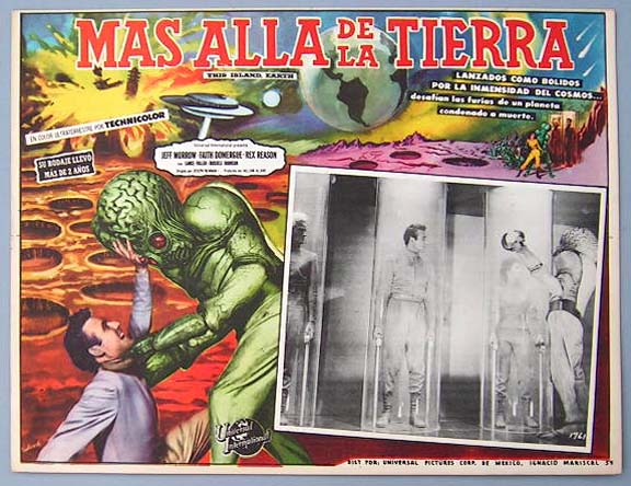 Beautiful Mexican jumbo lobby card (12.5x16.5") from the 1954 Universal sci-fi film, THIS ISLAND EARTH, which starred Jeff Morrow, Faith Domergue, Rex Reason, Lance Fuller, Russell Johnson and Douglas Spencer. $125 each |