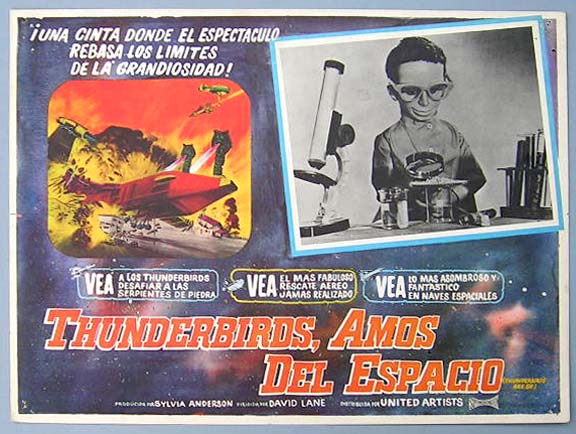 Beautiful Mexican jumbo lobby card (12.5x16.5") from the 1967 British sci-fi / puppet film, THUNDERBIRDS ARE GO, which featured the voices of Sylvia Anderson, Ray Barrett, Alexander Davion and Peter Dyneley. The movie was based on the 1960s sci-fi TV show, THE THUNDERBIRDS. It featured Gerry Anderson's SUPERMARIONETTES, which appeared in several 1960s children's cult television programs, including SUPERCAR, FIREBALL XL5, STINGRAY and CAPTAIN SCARLET AND THE MYSTERONS. $35 each |