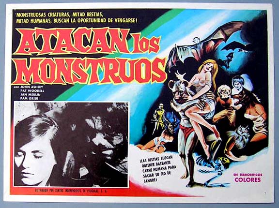 Beautiful Mexican jumbo lobby card (12x16") from the 1972 Demension sci-fi / horror film, THE TWILIGHT PEOPLE, which starred John Ashley, Pat Woodell, Jan Merlin, Charles Macaulay and Pam Grier. The movie was a low-budget combination of 'Island of Lost Souls' and 'Most Dangerous Game.' $15 each |