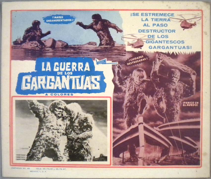 Great Mexican jumbo lobby card (13x15.5") from the 1966 Toho / Japanese sci-fi / giant monster film, WAR OF THE GARGANTUAS, which starred Russ Tamblyn, Kumi Mizuno, Kenji Sahara, Nobuo Nakamura, Jun Tazaki and Kipp Hamilton. $20 each |