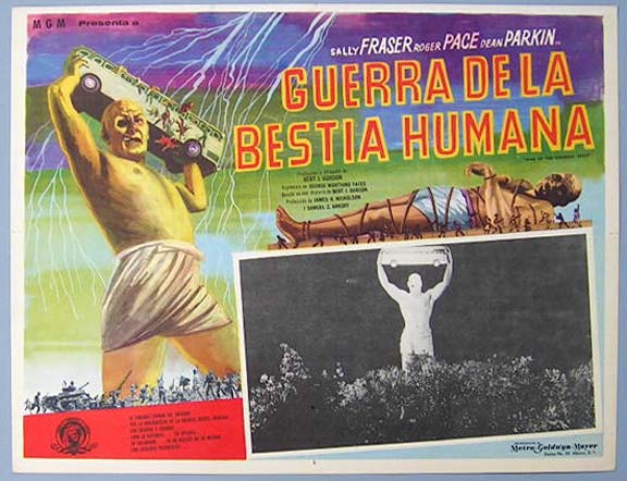 Beautiful Mexican jumbo lobby card (12.5x16.5") from the 1958 AIP Sci-fi film, WAR OF THE COLOSSAL BEAST, which starred Sally Fraser, Roger Pace, Duncan 'Dean' Parkin and Russ Bender. The movie, which was directed by Bert I. Gordon, was the sequel to the cult classic, THE AMAZING COLOSSAL MAN. $45 each |