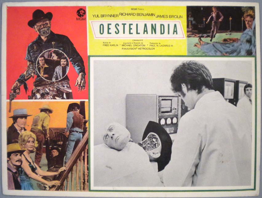 Beautiful Mexican jumbo lobby card (12.5x16.5") from the 1973 MGM sci-fi / western film, WESTWORLD, which starred Yul Brynner, Richard Benjamin, James Brolin, Norman Bartold, Alan Oppenheimer and Victoria Shaw. The film was directed by Michael Crichton. $25 |