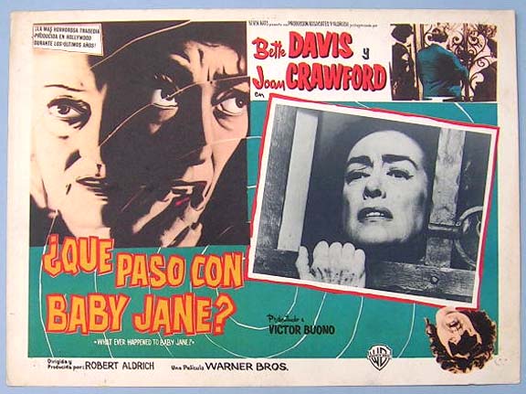 Beautiful Mexican jumbo lobby card (12.5x16.5") from the 1962 Warner Brothers horror film, WHAT EVER HAPPENED TO BABY JANE, which starred Bette Davis, Joan Crawford, Victor Buono and Wesley Addy. $25 each |