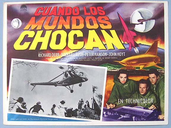 Beautiful Mexican jumbo lobby card (12.5x16.5") from the 1951 Paramount sci-fi film, WHEN WORLDS COLLIDE, which starred Richard Derr, Barbara Rush, Peter Hansen, John Hoyt and Larry Keating. $35 each |
