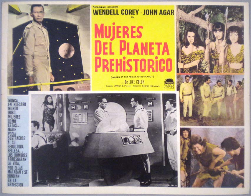 Beautiful Mexican jumbo lobby card (12.75x16.5") from the 1966 Realart sci-fi / adventure film WOMEN OF THE PREHISTORIC PLANET, which starred Wendell Corey, Keith Larsen, John Agar, Paul Gilbert, Merry Anders and Adam Roarke. The film was directed by Arthur C. Pierce. $25 |