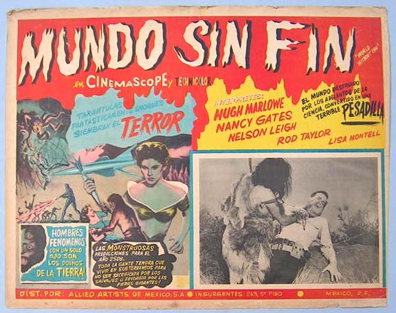 Beautiful Mexican jumbo lobby card (12.5x16.5") from the 1956 Allied Artists sci-fi / time travel film, WORLD WITHOUT END, which starred Hugh Marlowe, Nancy Gates, Rod Taylor, Lisa Montell and Nelson Leigh. Part of the right border has been trimmed, but this does not affect the image area. The card will display beautifully. $25 each |