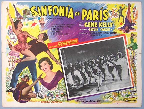 Beautiful Mexican jumbo lobby card (12.5x16.5") from the 1951 MGM musical / romance film, AN AMERICAN IN PARIS, which starred Gene Kelly, Leslie Caron, Oscar Levant, Georges Guetary and Nina Foch. $35 each |