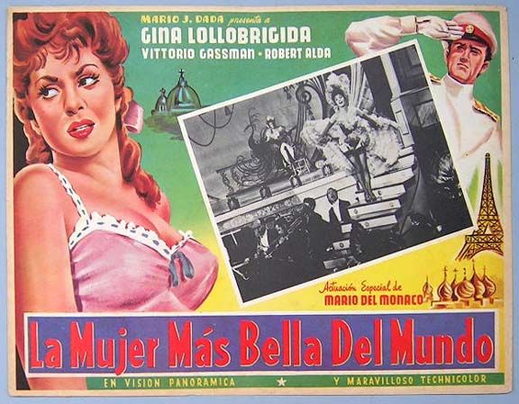 Beautiful Mexican jumbo lobby card (12.5x16.5") from the 1956 European comedy / romance film, BEAUTIFUL BUT DANGEROUS, which starred Gina Lollobrigida, Vittorio Gassman, Robert Alda, Anne Vernon and Tamara Lees. $35 each |