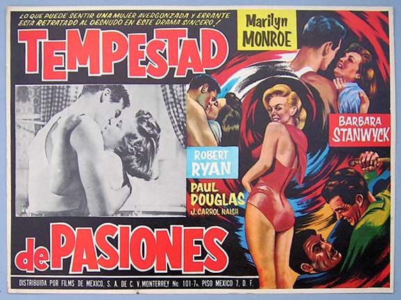 Beautiful Mexican jumbo lobby card (12.5x16.5") from the 1952 RKO noir / melodrama film, CLASH BY NIGHT, which starred Barbara Stanwyck, Paul Douglas, Robert Ryan, Marilyn Monroe and J. Carrol Naish. $45 each |