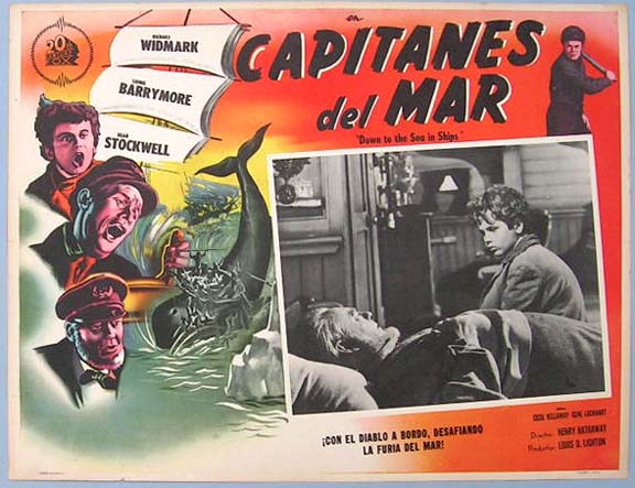 Beautiful Mexican jumbo lobby card (12.5x16.5") from the 1949 20th Century Fox adventure film, DOWN TO THE SEA IN SHIPS, which starred Richard Widmark, Lionel Barrymore, Dean Stockwell, Cecil Kellaway and Gene Lockhart. $20 each |