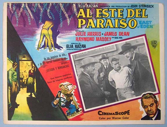 Beautiful Mexican jumbo lobby card (12.5x16.5") from the 1955 Warner Brothers drama film, EAST OF EDEN, which starred Julie Harris, James Dean, Raymond Massey, Burl Ives, Richard Davalos and Jo Van Fleet. $35 each |