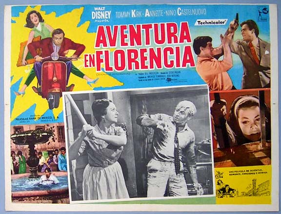 Beautiful Mexican jumbo lobby card (12.5x16.5") from the 1962 Walt Disney film, ESCAPADE IN FLORENCE which starred Tommy Kirk, Annette Funicello, Nino Castelnuovo and Elisa Cegani. The card pictures a Vespa style scooter on the artwork. $25 each |