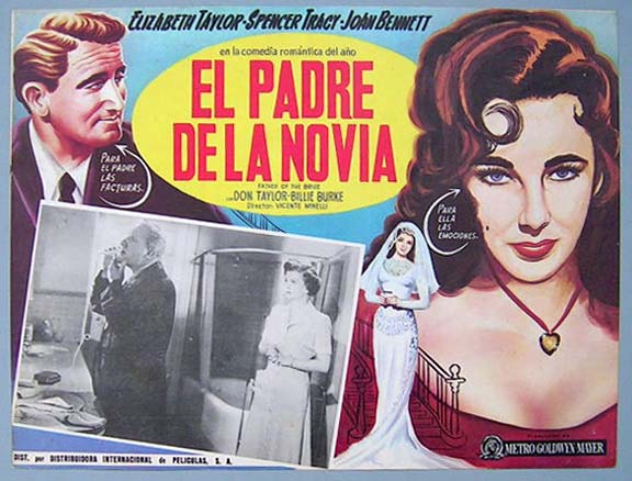 Beautiful borderless Mexican jumbo lobby card (12.5x16.5") from the 1950 MGM comedy film, FATHER OF THE BRIDE, which starred Spencer Tracy, Joan Bennett, Elizabeth Taylor, Don Taylor, Billie Burke and Leo G. Carroll. $20 each |