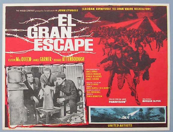Beautiful Mexican jumbo lobby card (12.5x16.5") from the 1963 United Artists World War II action film, THE GREAT ESCAPE, which starred Steve McQueen, James Garner, Richard Attenborough, James Donald, Charles Bronson, Donald Pleasence and James Coburn. $35 each |