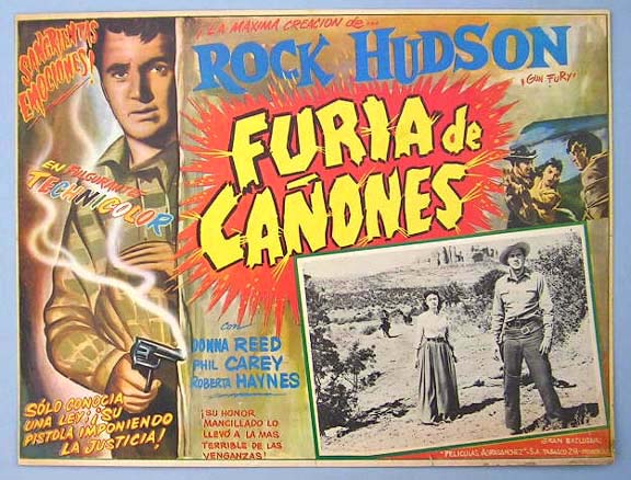 Beautiful Mexican jumbo lobby card (12.5x16.5") from the 1953 Columbia 3-D western film, GUN FURY, which starred Rock Hudson, Donna Reed, Philip Carey, Roberta Haynes and Leo Gordon. $20 each |